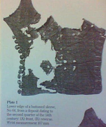 Cloth buttons appear among the remnants of garments found in London quite often, as this was the “chief method of fastening” (Crowfoot et al., 164). Buttons, buttonhole stitches, eyelet techniques and period sewing methods that would have been incorporated and used for a Cotehardie are well documented in Textiles and Clothing c. 1150-1450. The following images detail the cloth buttons, buttonholes and period stitches used to achieve them taken from the book: